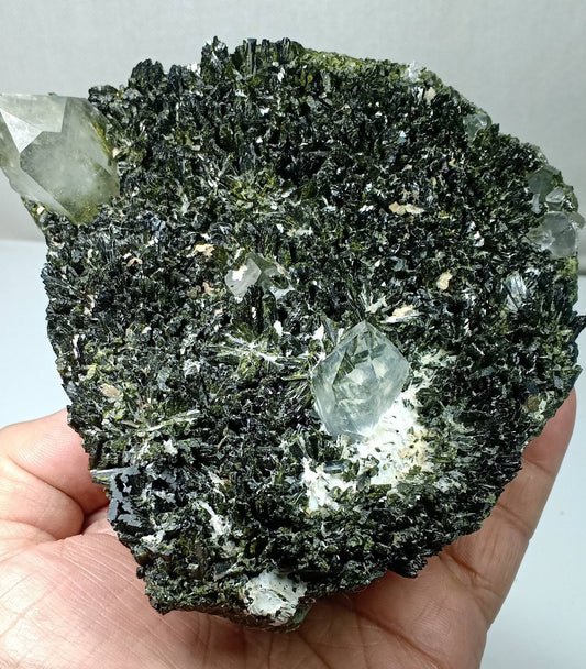 Epidote self standing cluster with perfectly terminated quartz crystals 970 grams