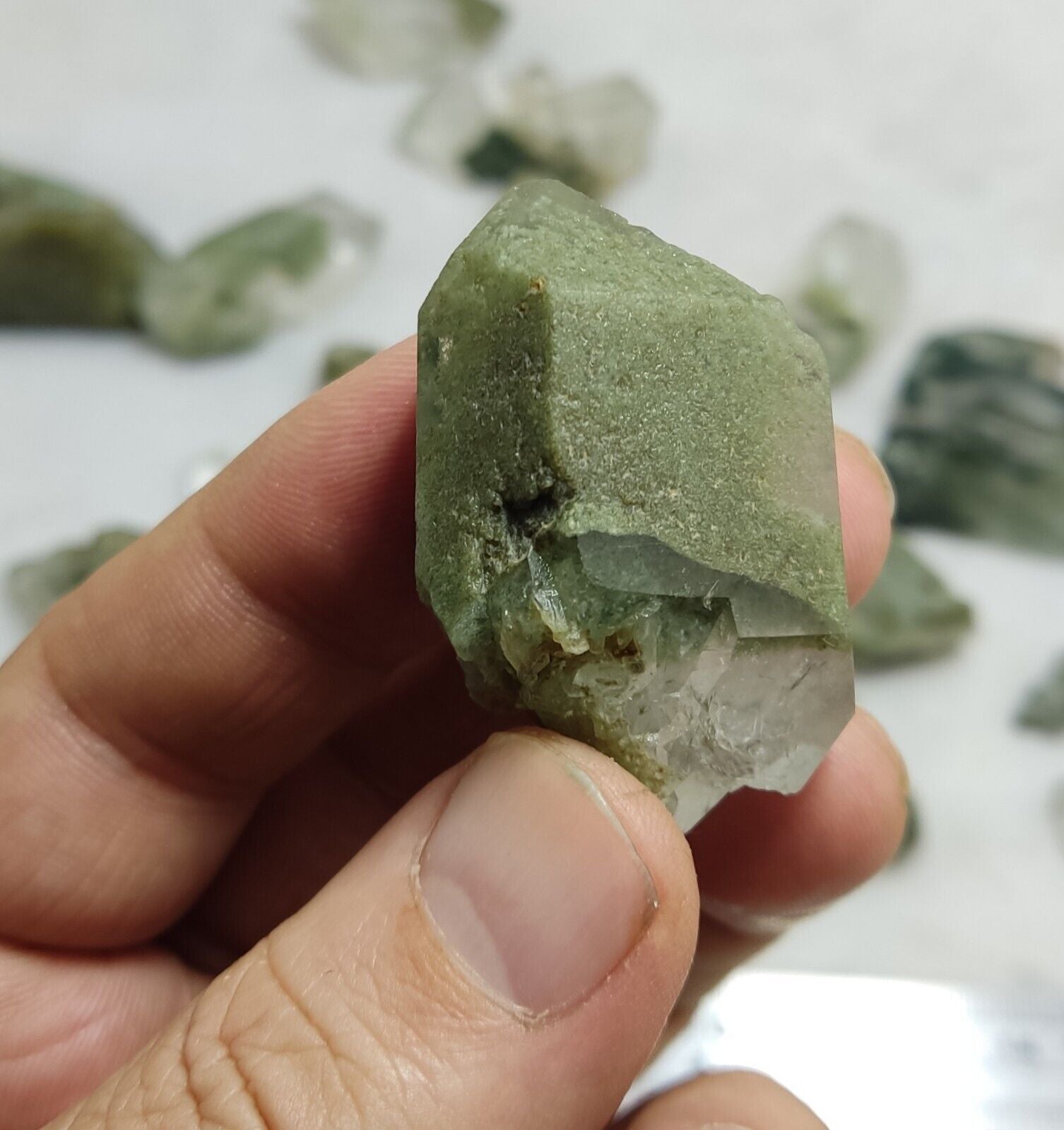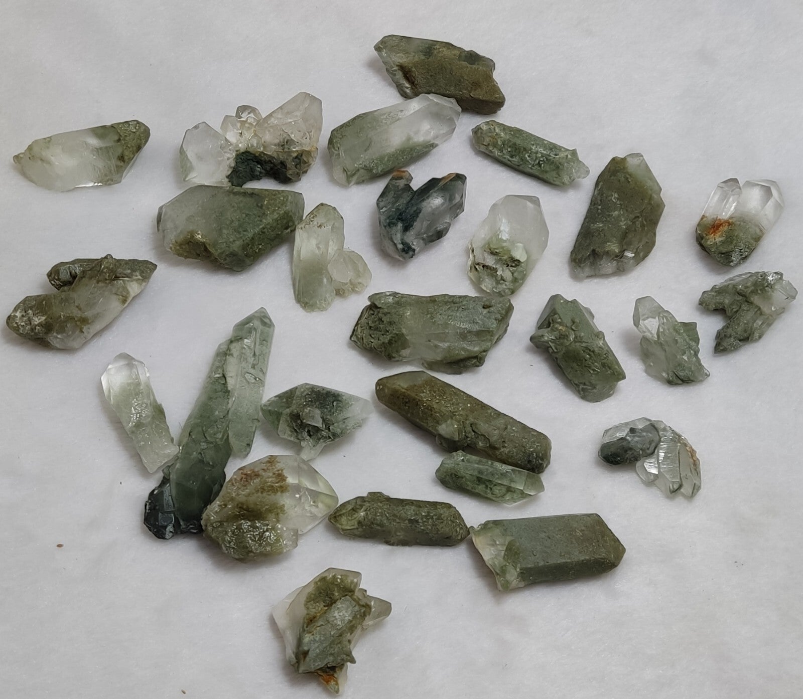 Fine terminations and green inclusions of chlorite. Some crystals have blemishes on them.