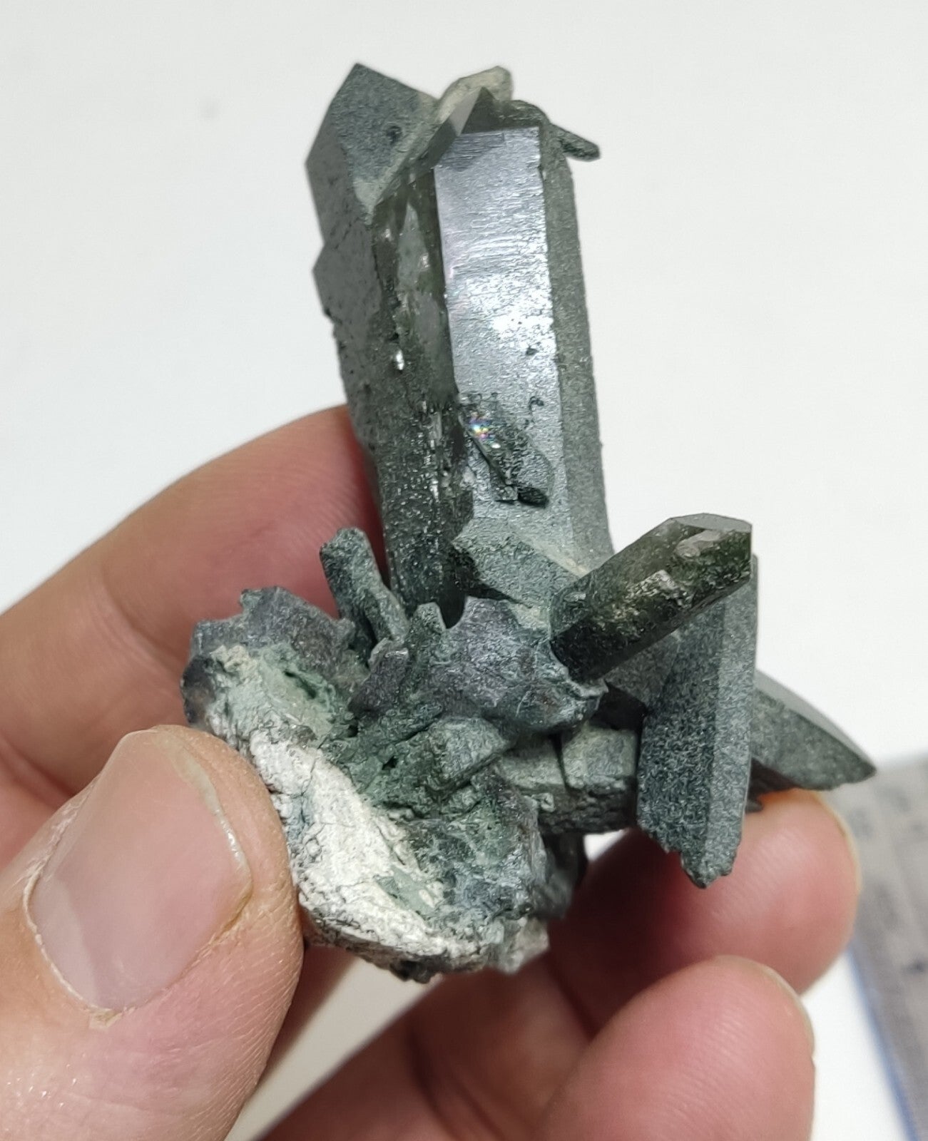Fine terminations and green inclusions of chlorite. Crystals are standing on matrix.