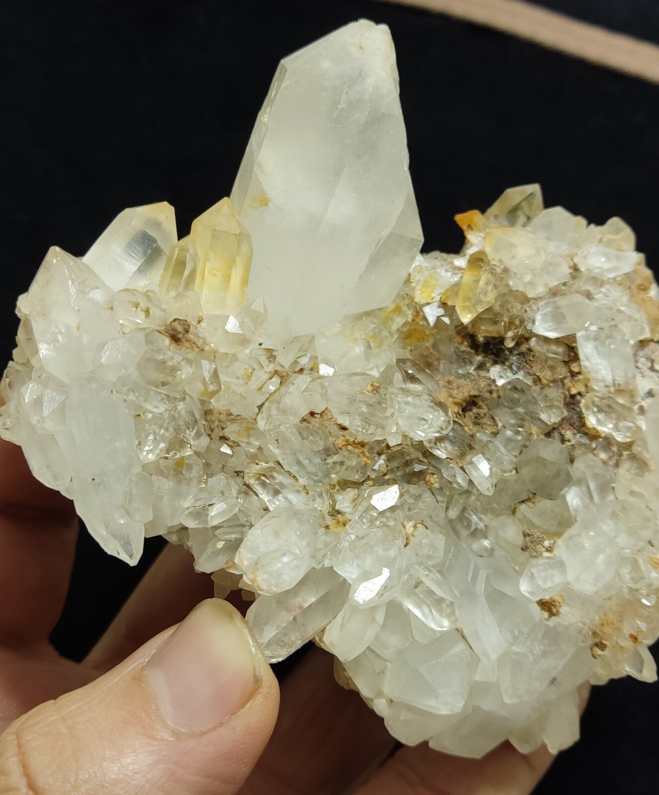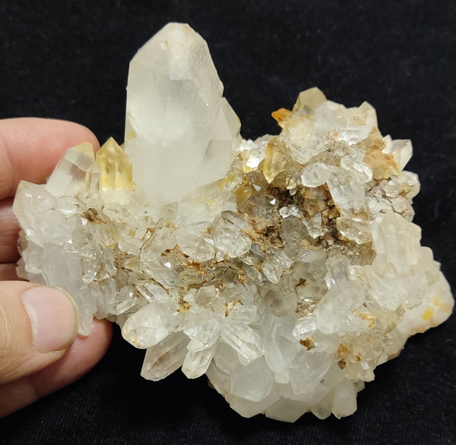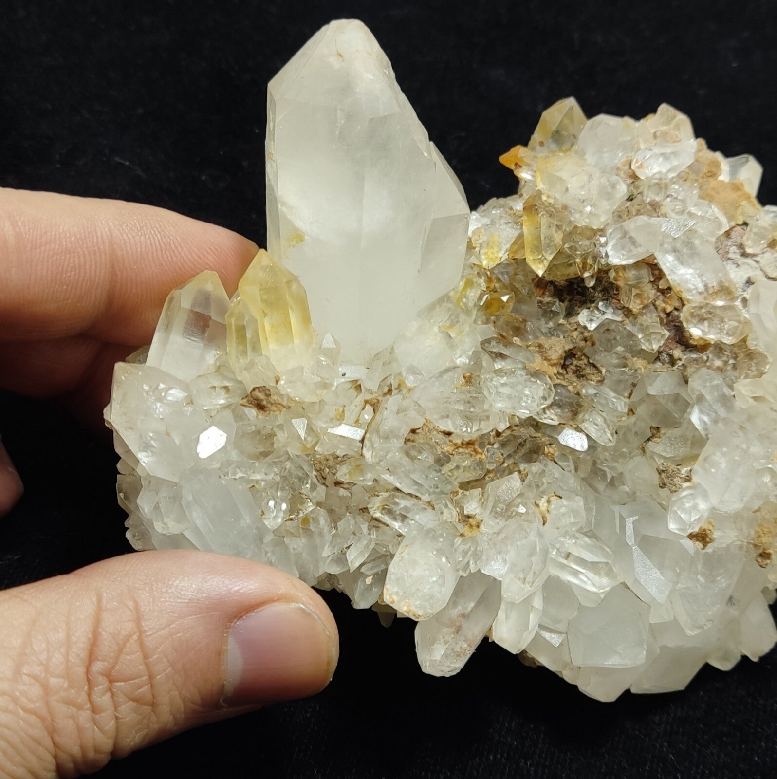 Some quartz crystals have yellow tips suggesting iron inclusions.