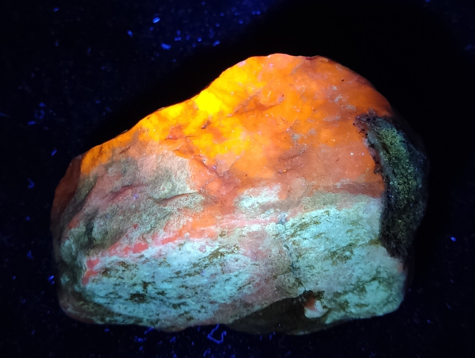 Hackmanite is fluorescent in uv light and is exhibiting light phosphorescence after exposure to uv. Pictures are also taken in 365nm UV light.