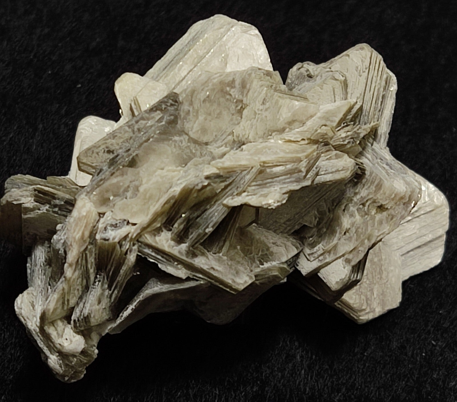 An aesthetic specimen of mica variety muscovite. In association there is a black tourmaline crystal, and albite/feldspar.