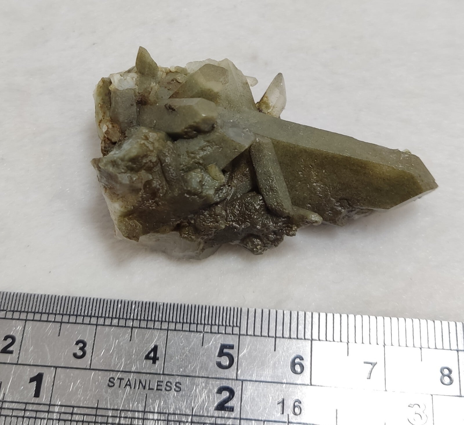 Crystals have green inclusions of chlorite.