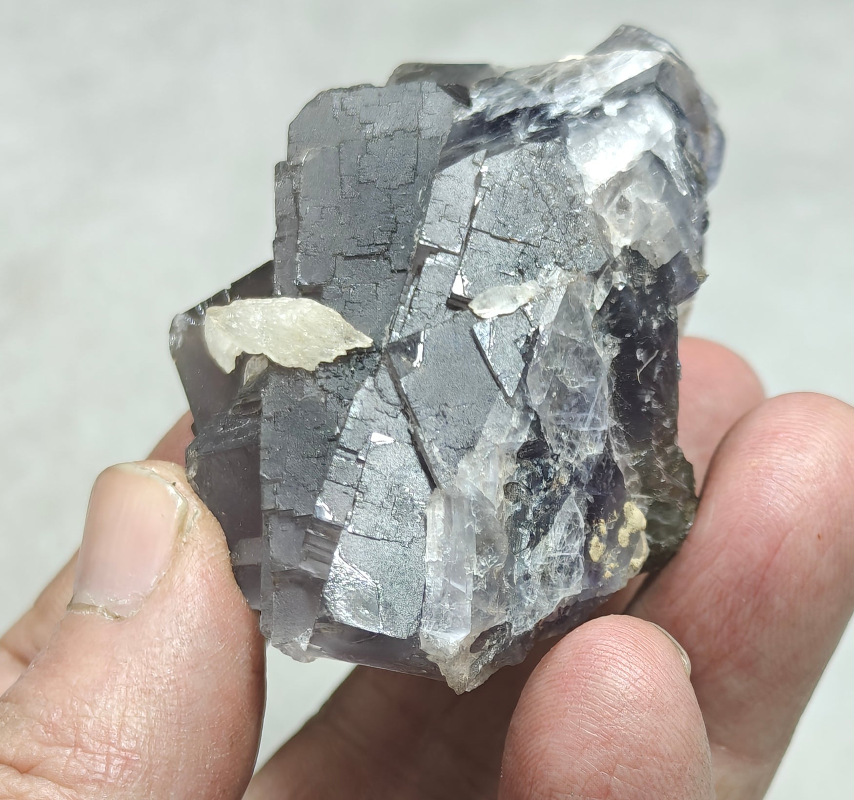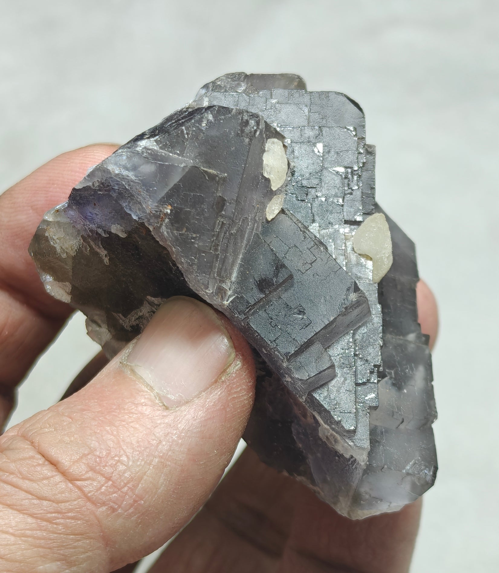 An amazing Single beautiful specimen of grey/purple fluorite with calcite crystals 150 grams
