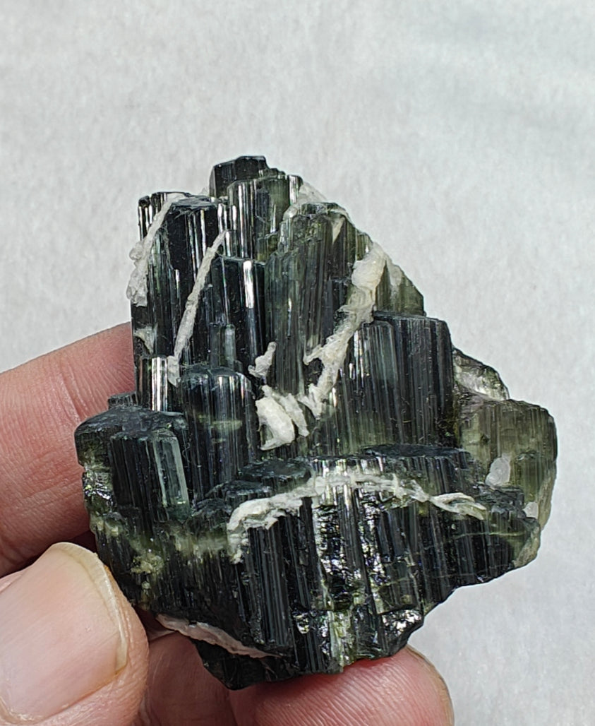 Single dark green Tourmaline crystals cluster with beautiful chatoyant effects.