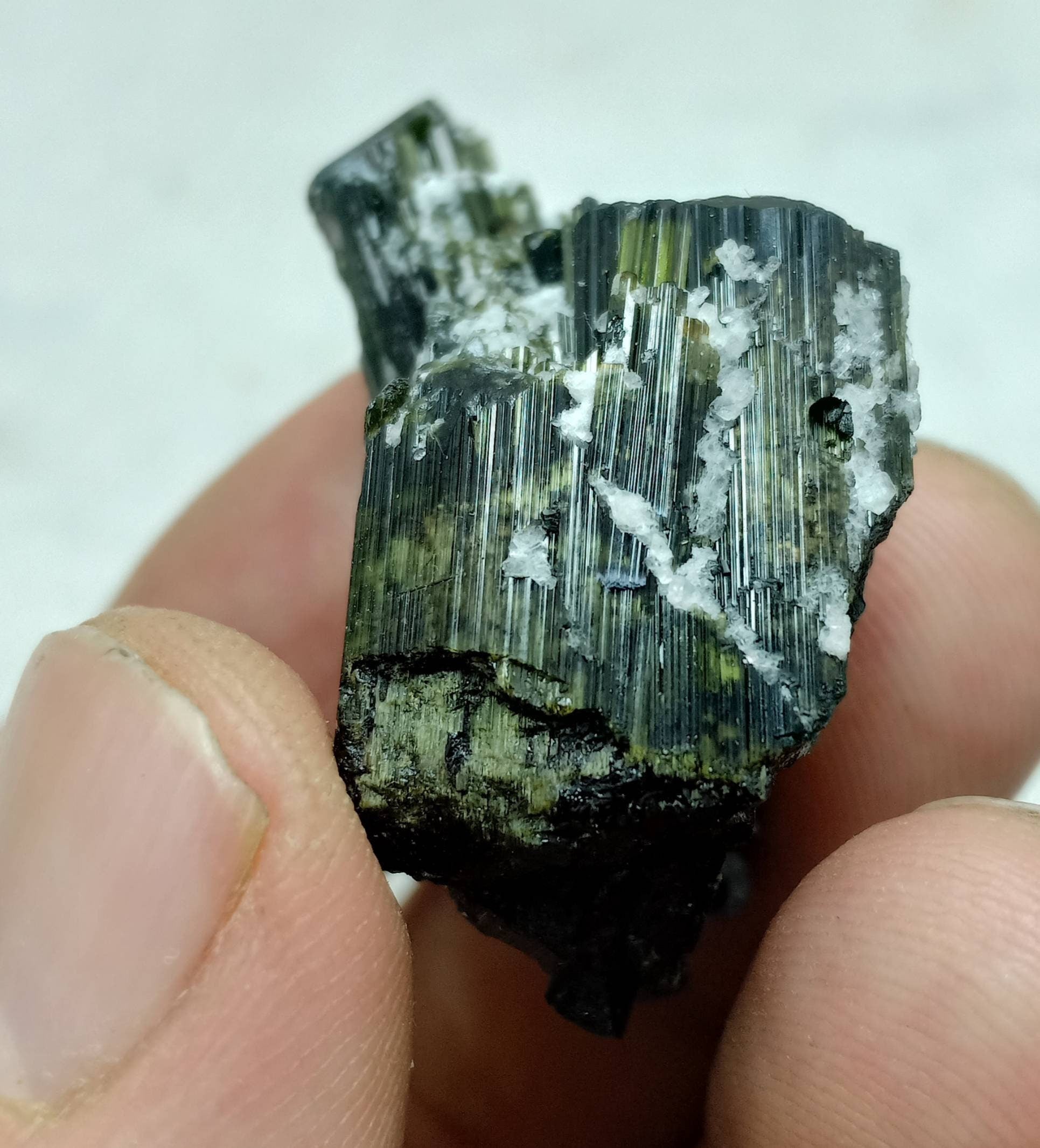 Single dark green Tourmaline crystals cluster with beautiful chatoyant effects.