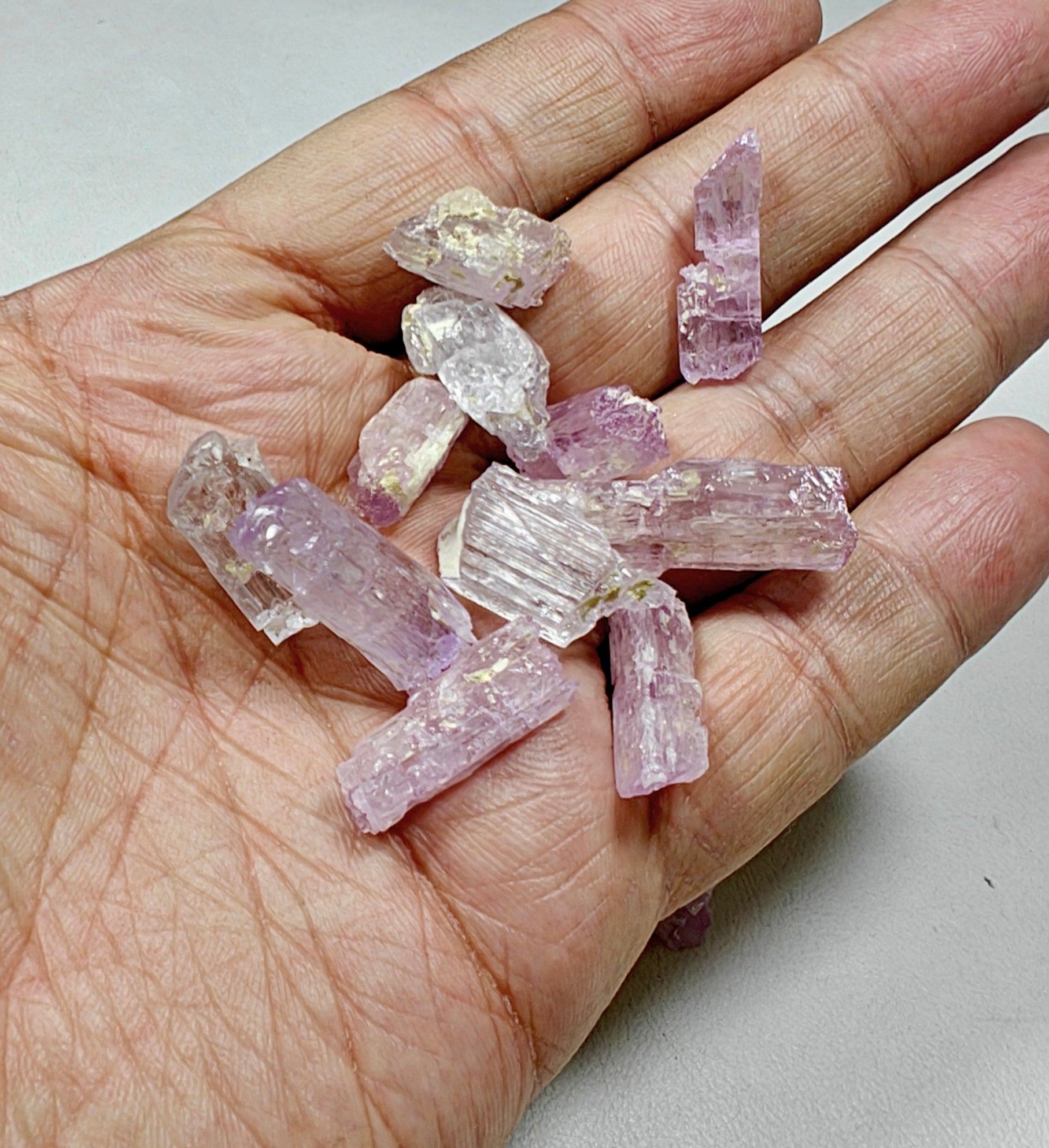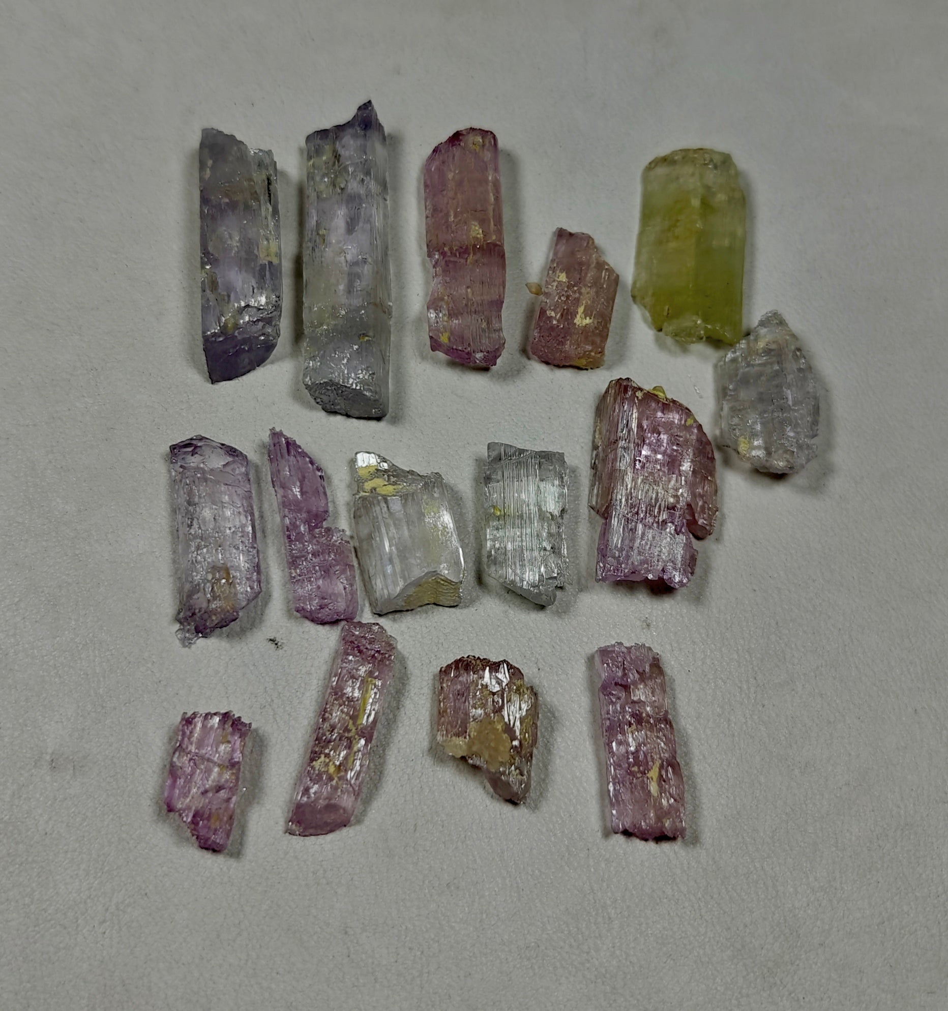 π A beautiful lot of natural etched Kunzite/Spodumene crystals, showcasing soft pastel hues ranging from delicate pinks to lilac, clear, and a rare greenish-yellow tone.