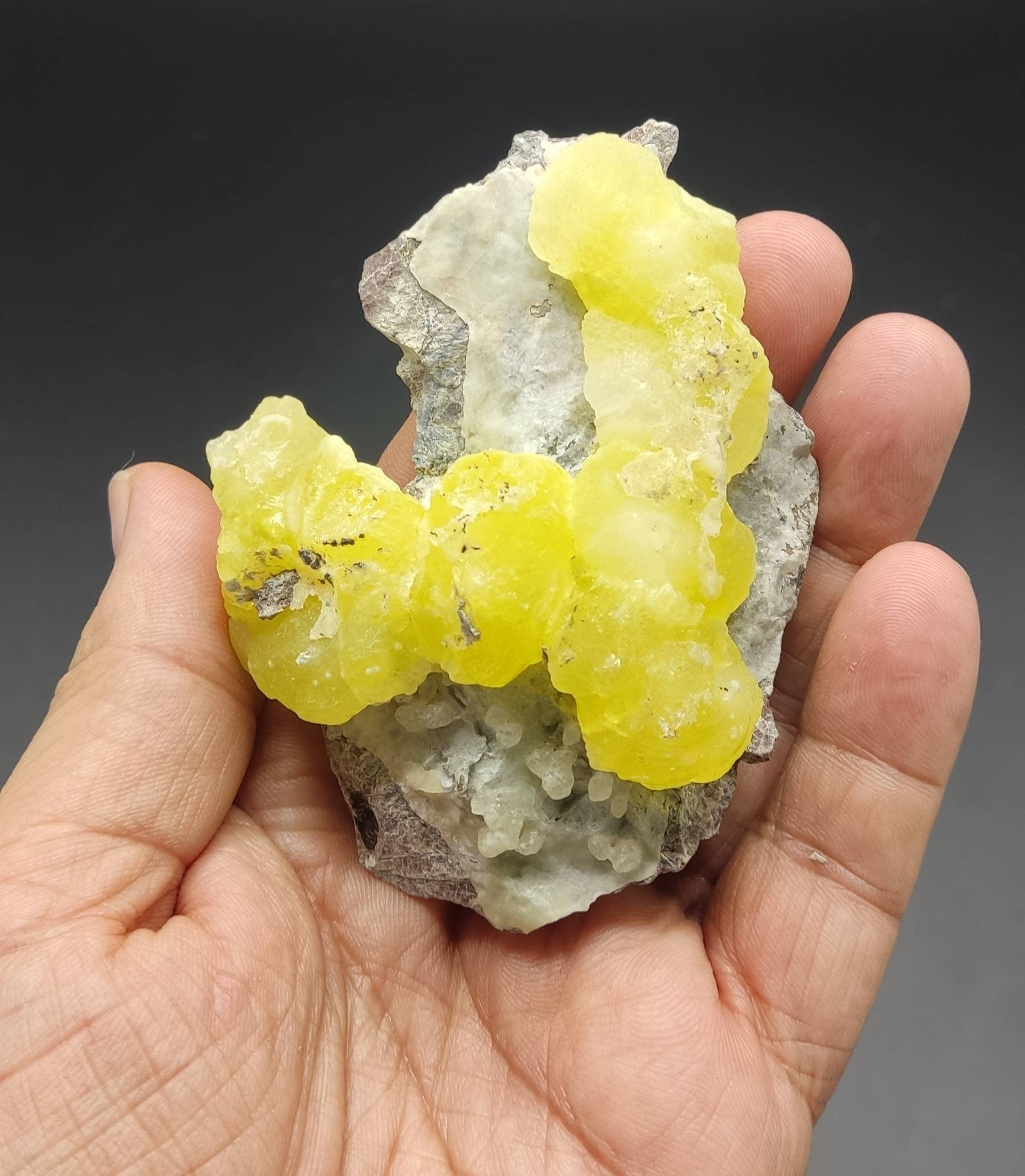 **The color of brucite is automatically enhanced in camera/lighting. There are several factors causing this. The Yellow color itself is enhanced in cameras. Therefore the actual color of this specimen may be light compared to pictures**
