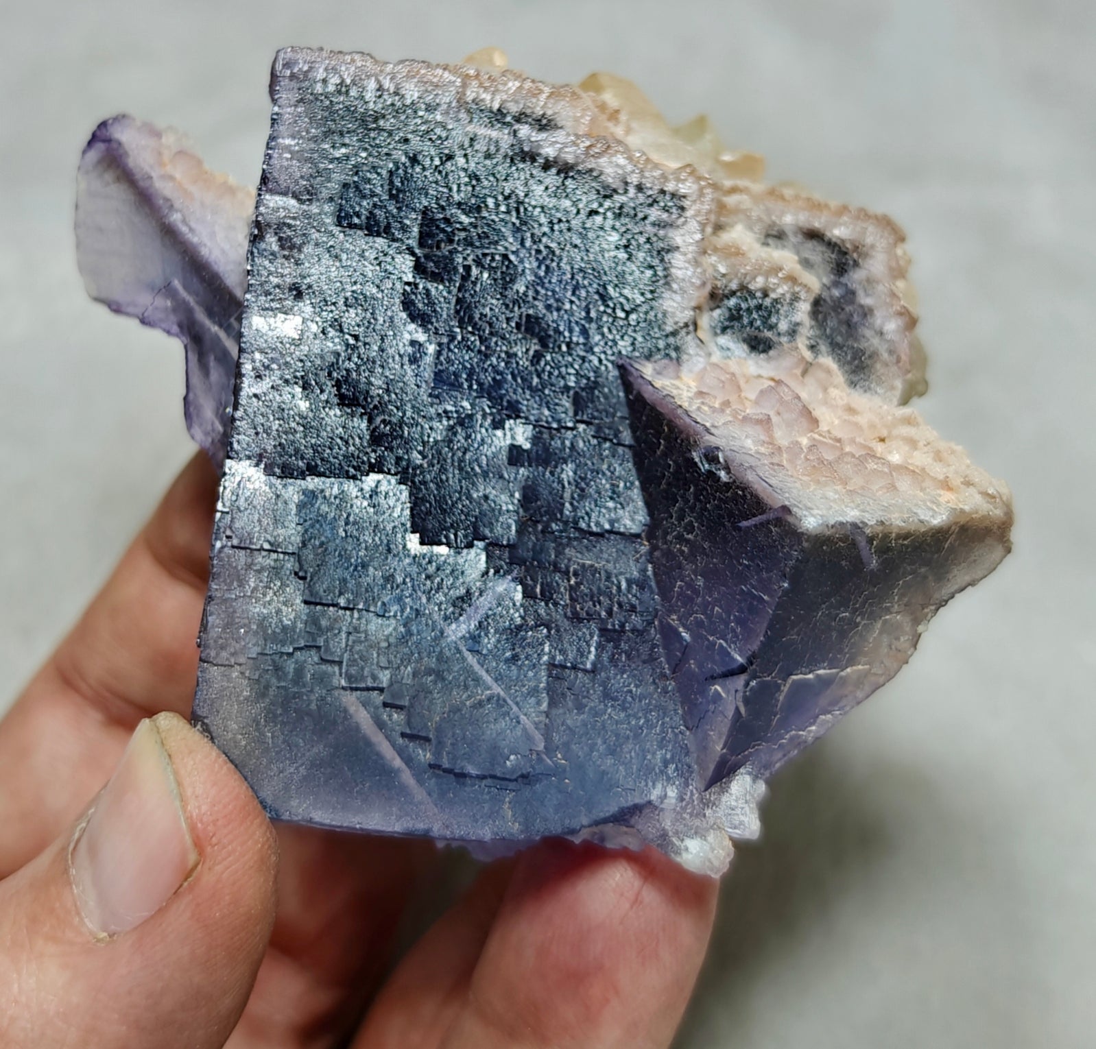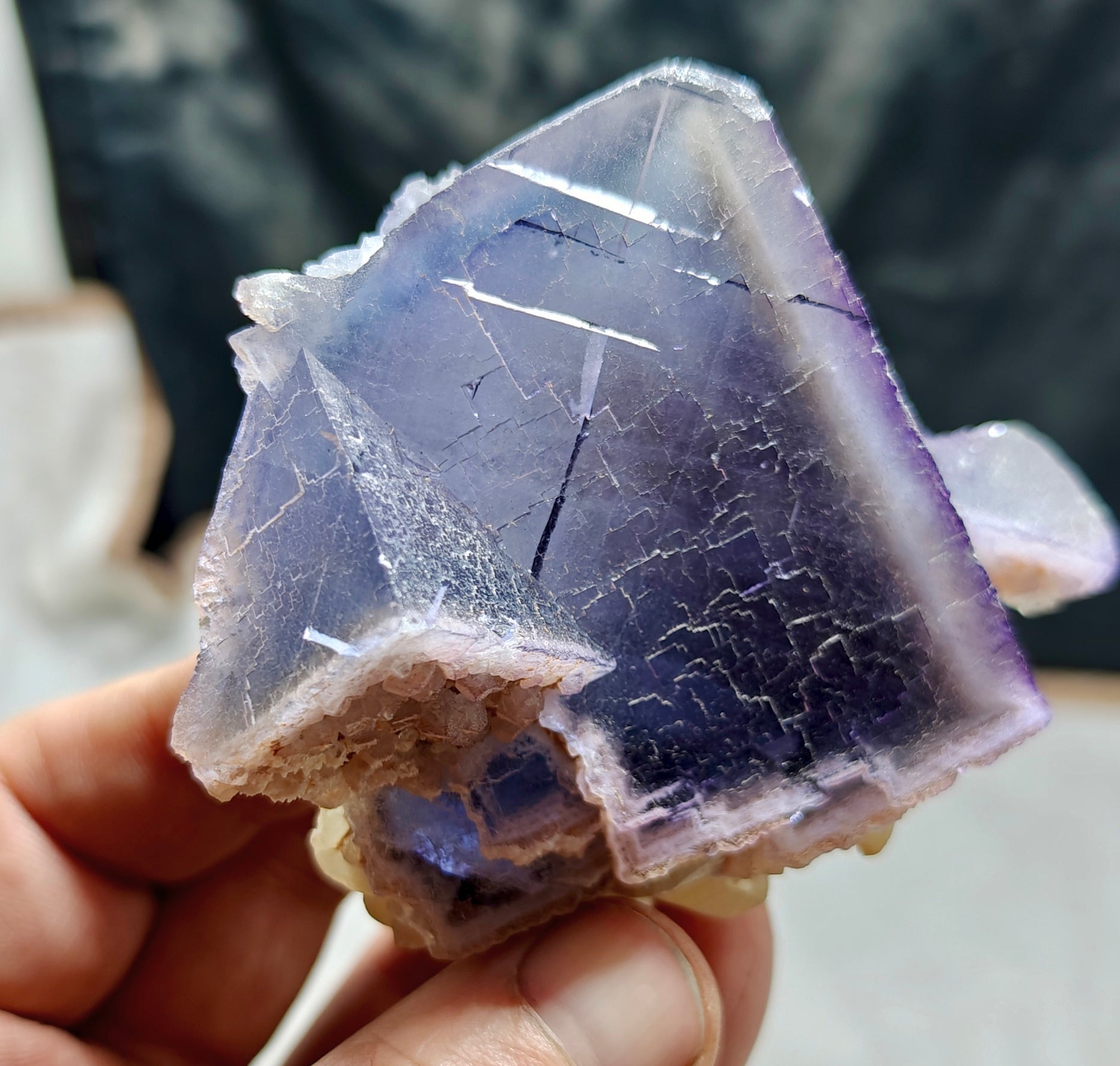 A beautiful purple Fluorite Specimen with Dogteeth calcite crystals from Balochistan. Beautiful color zoning